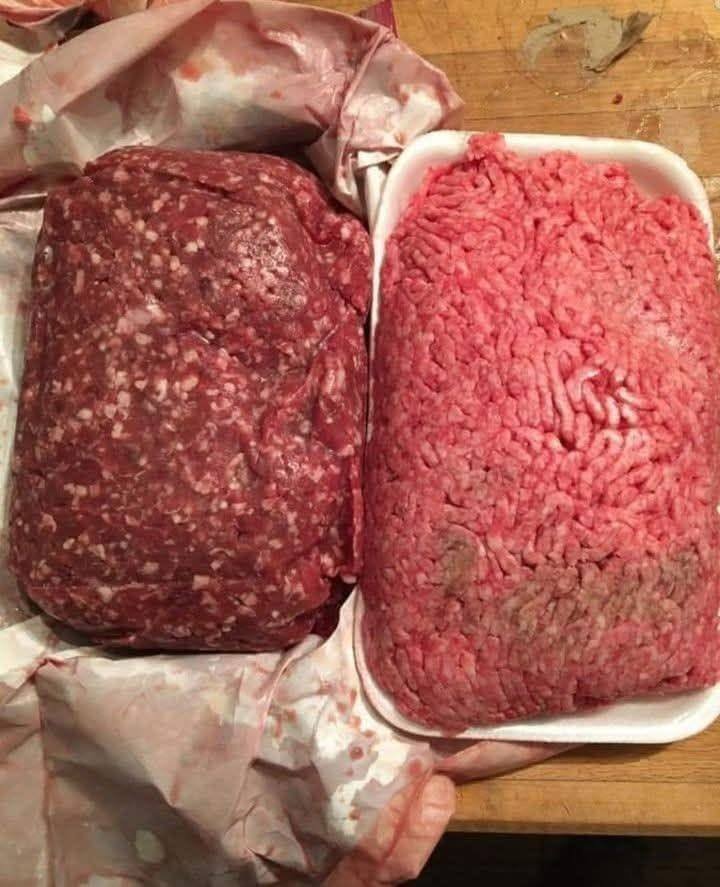- Right (Store-bought): This beef is typically a brighter, more uniform pink color and often comes from a mix of different cows and cuts.